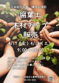 月日:4月11日(土) | 場所:北本市子供公園 時間:午後1時30分〜4時30分 定員:10名 受付:3月14日(土)午前9時30分より総合公園窓口または電話にて受付開始 ※定員になり次第受付終了になります。 ◆参加費は当日お支払いいただきます ◆ 腐葉土&木材チップ販売 別途土のう袋代金(1袋100円)がかかります。 |