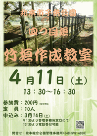 月日:3月28日(土)・29日(日)の2日間 場所:北本市高尾さくら公園 時間:午前10時〜午後3時 内容:今年もさくらまつりを開催します! 会場となる高尾さくら公園にはソメイヨシノやシダレザクラ等、 約30種200本の桜の木が植えられています。 ◆当日はステージイベント、地元商店、キッチンカーの出店を予定しています。 詳細は随時更新予定。 ◆ステージイベントのスケジュールはこちらをクリック! ◆会場・出店マップはこちらをクリック! ◆2日間限定の無料シャトルバス時刻表はこちら ◆ 四つ目垣作成教室 (参加費 200円) |