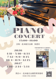 月日: (2026年)3/22、4/12、19(各回 日曜日) | 場所:高尾さくら公園 ※雨天時は中止となります 時間:午前9時〜10時 定員:約30名 受付:申込不要 当日会場にて受付 休日の朝、ヨガで体をリフレッシュ!! 予定の合う時に是非ご参加ください(*^-^*) ◆ ピアノコンサート(入場無料 入退場自由) |